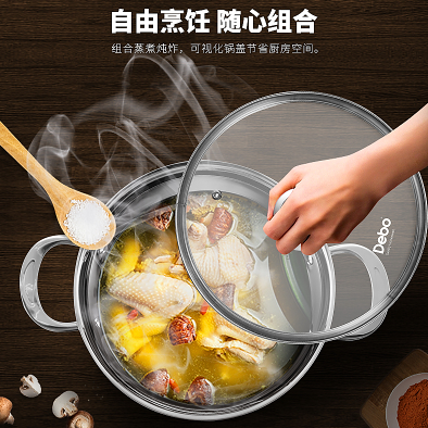 燉,蒸,煮,油炸全能鍋,獨(dú)創(chuàng)造型,外觀新穎時(shí)尚,擁有獨(dú)家設(shè)計(jì)專利。全功能設(shè)計(jì),配有蒸格以及油炸濾網(wǎng),蒸、煮、炸、燉無所不能。材質(zhì)精選304醫(yī)用不銹鋼鋼制作,耐酸、耐堿、耐腐蝕,長(zhǎng)期使用安全健康。鍋蓋采用鋼化玻璃組合設(shè)計(jì),鍋蓋與鍋沿的緊密配合產(chǎn)生“水封效果”有效確保食物營(yíng)養(yǎng)成分不流失;